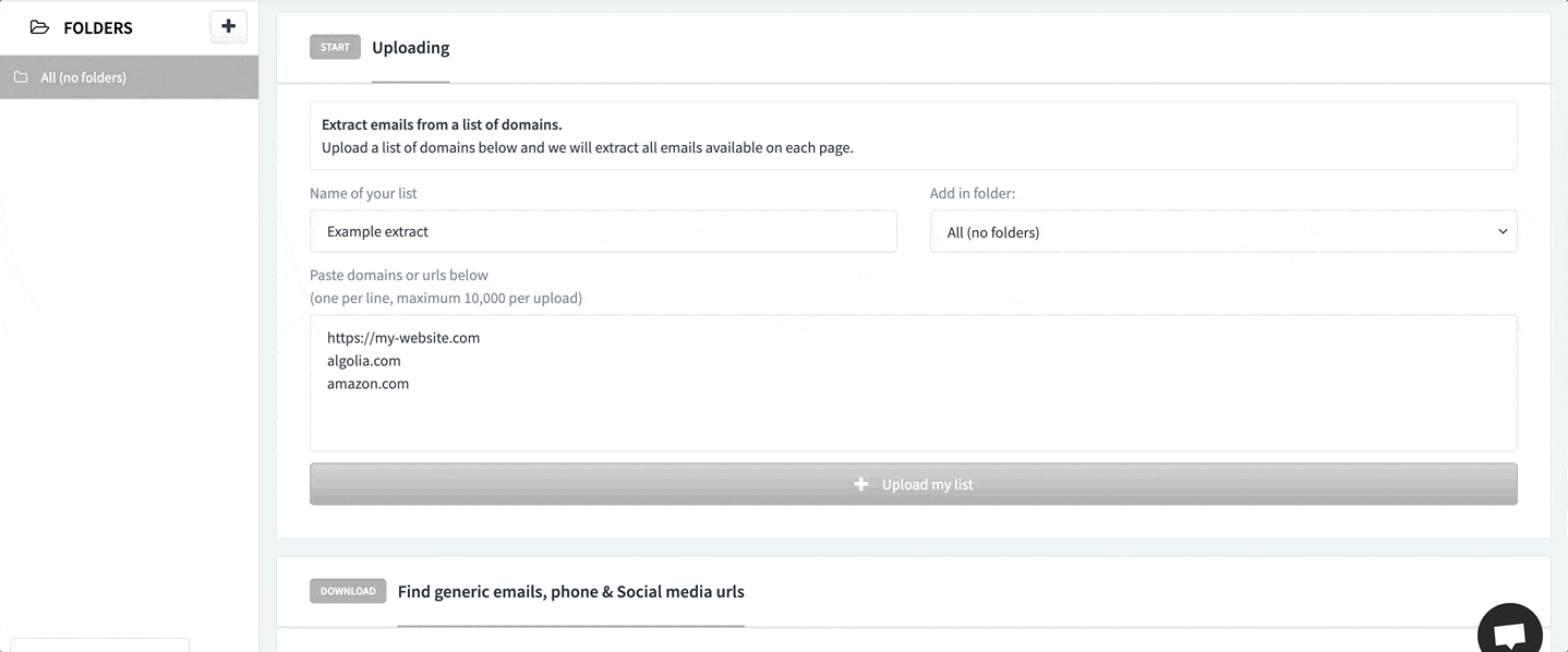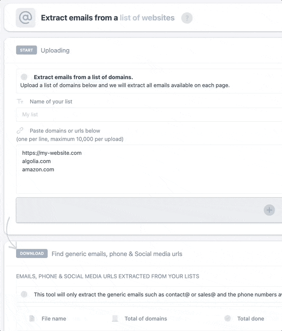 You can upload a list of domains and extracts emails, social media URLs, and usernames (Facebook, Twitter, etc.), phone numbers on all pages of each website. A report is available to download as Excel once all the emails are extracted. This is the best solution to extract all emails from a list of websites (companies).